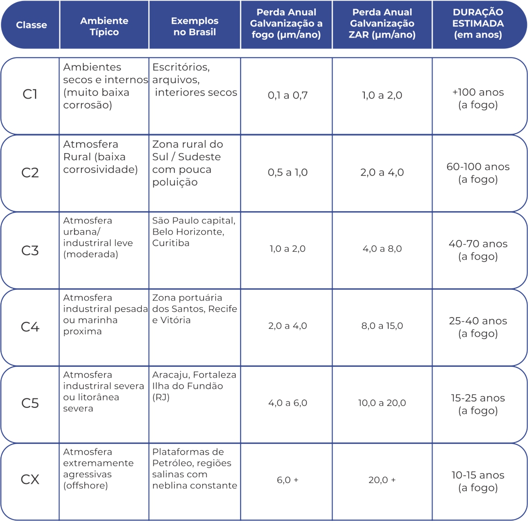 A durabilidade das estruturas metálicas está diretamente ligada às condições do ambiente em que serão instaladas. Nesta tabela, você encontra a classificação dos níveis de corrosividade (C1 a CX) segundo normas internacionais, e a estimativa de vida útil da galvanização a fogo em cada cenário. Use esta referência para escolher a solução Sunfix mais adequada ao seu projeto, garantindo performance e segurança a longo prazo.